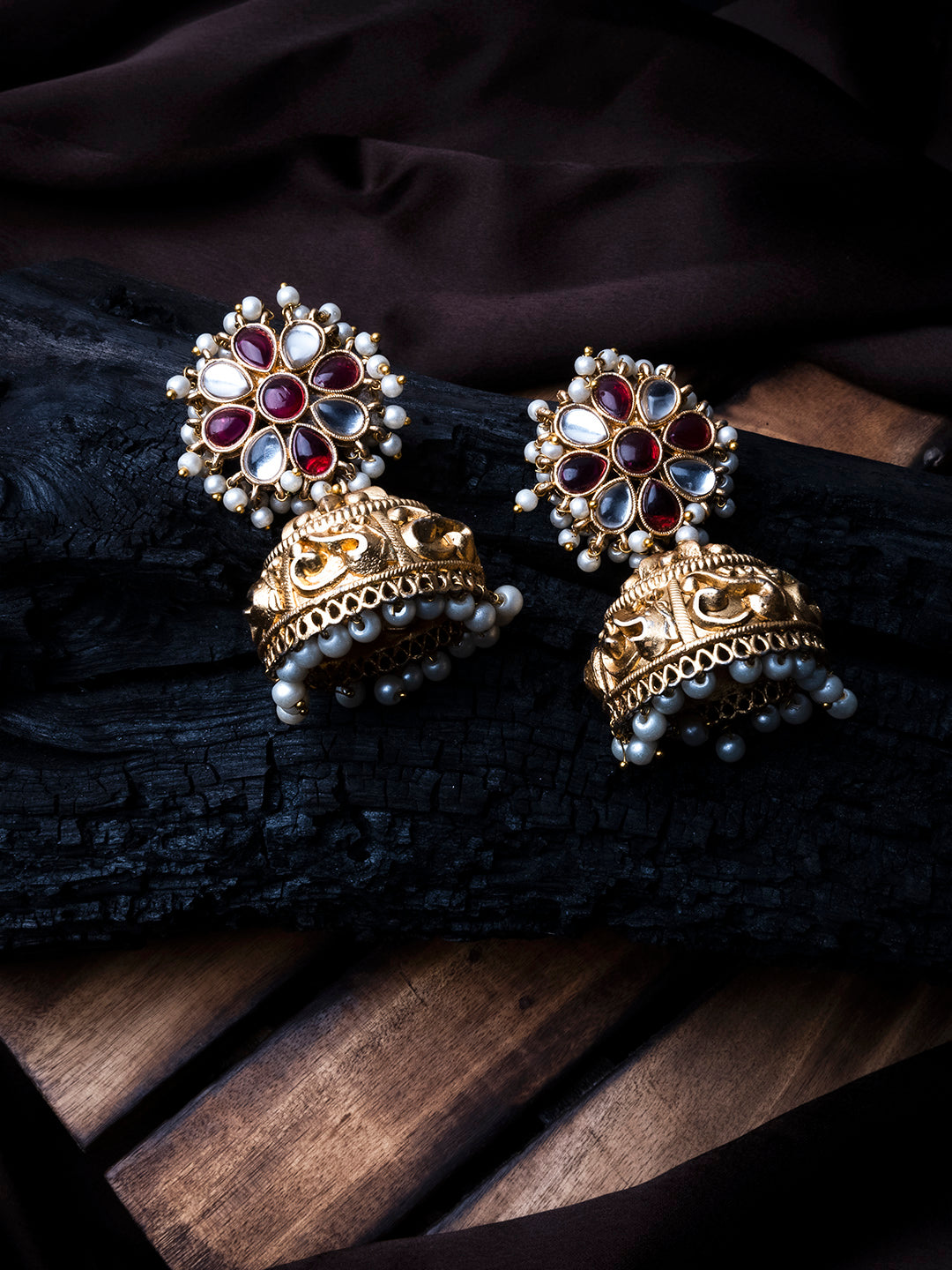 Gold plated Kundan jhumkas are designed with precision and finished with delicate pearl drops. Ideal for festive occasions, these earrings blend elegance with traditional craftsmanship for a stunning ethnic look.