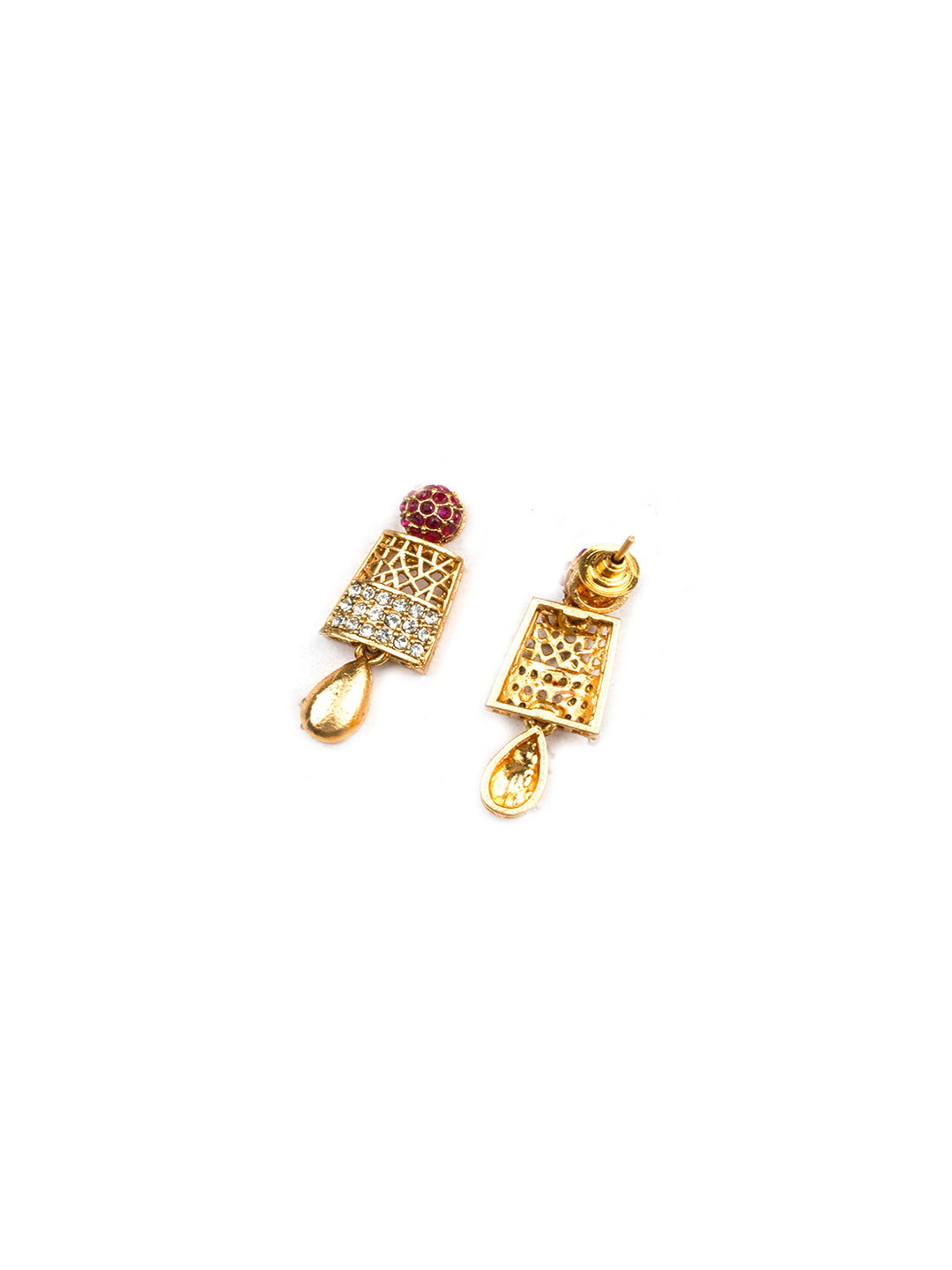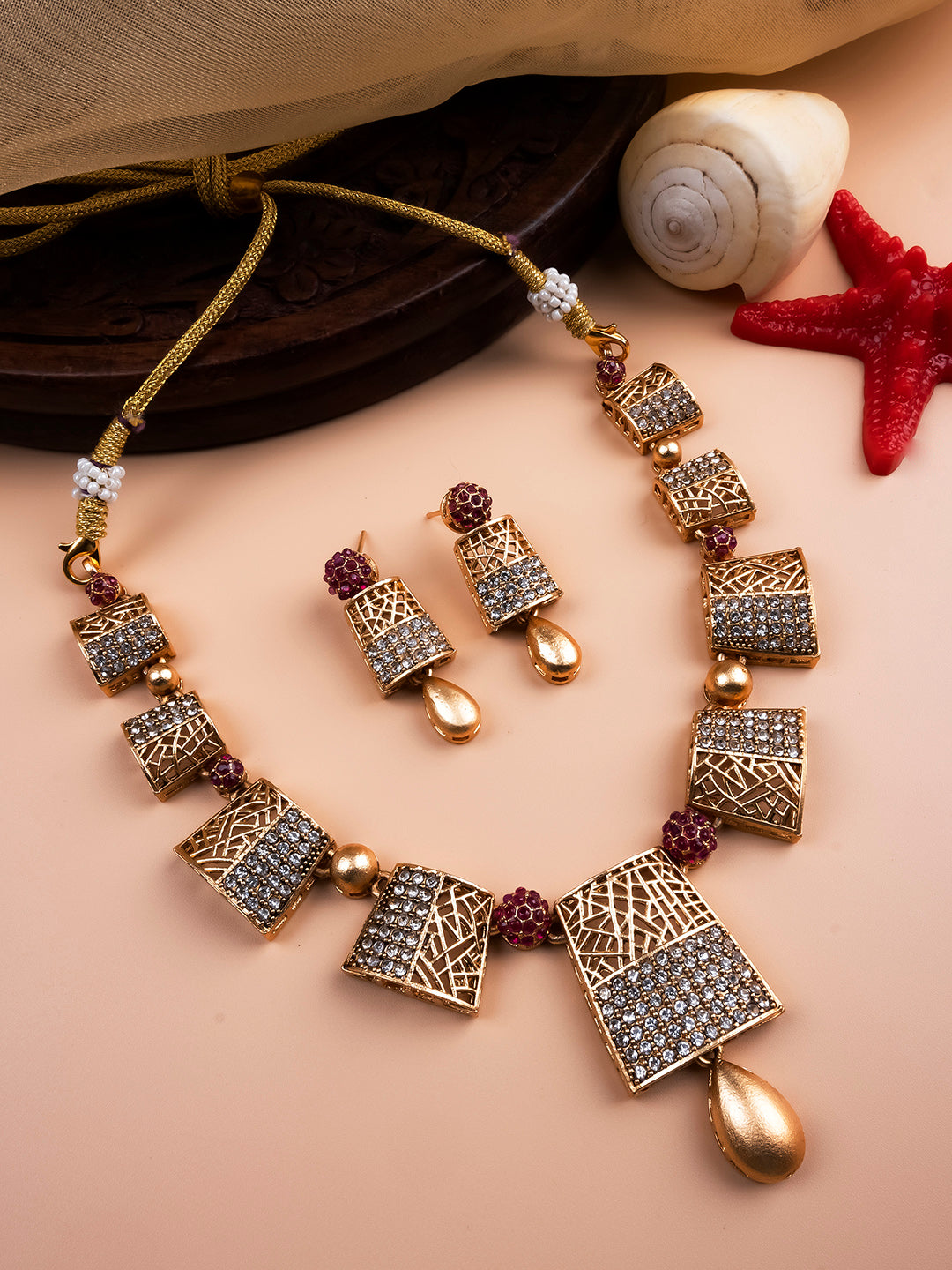 Elevate your ethnic look with this Gold Plated Necklace Set, adorned with AD stones that radiate opulence. The goddess engraving adds a divine touch, making it a must-have for special events.
