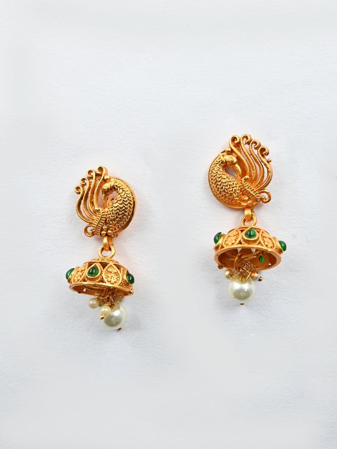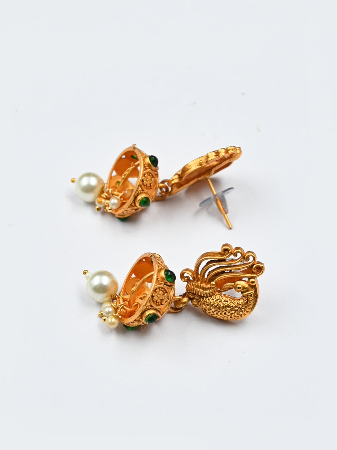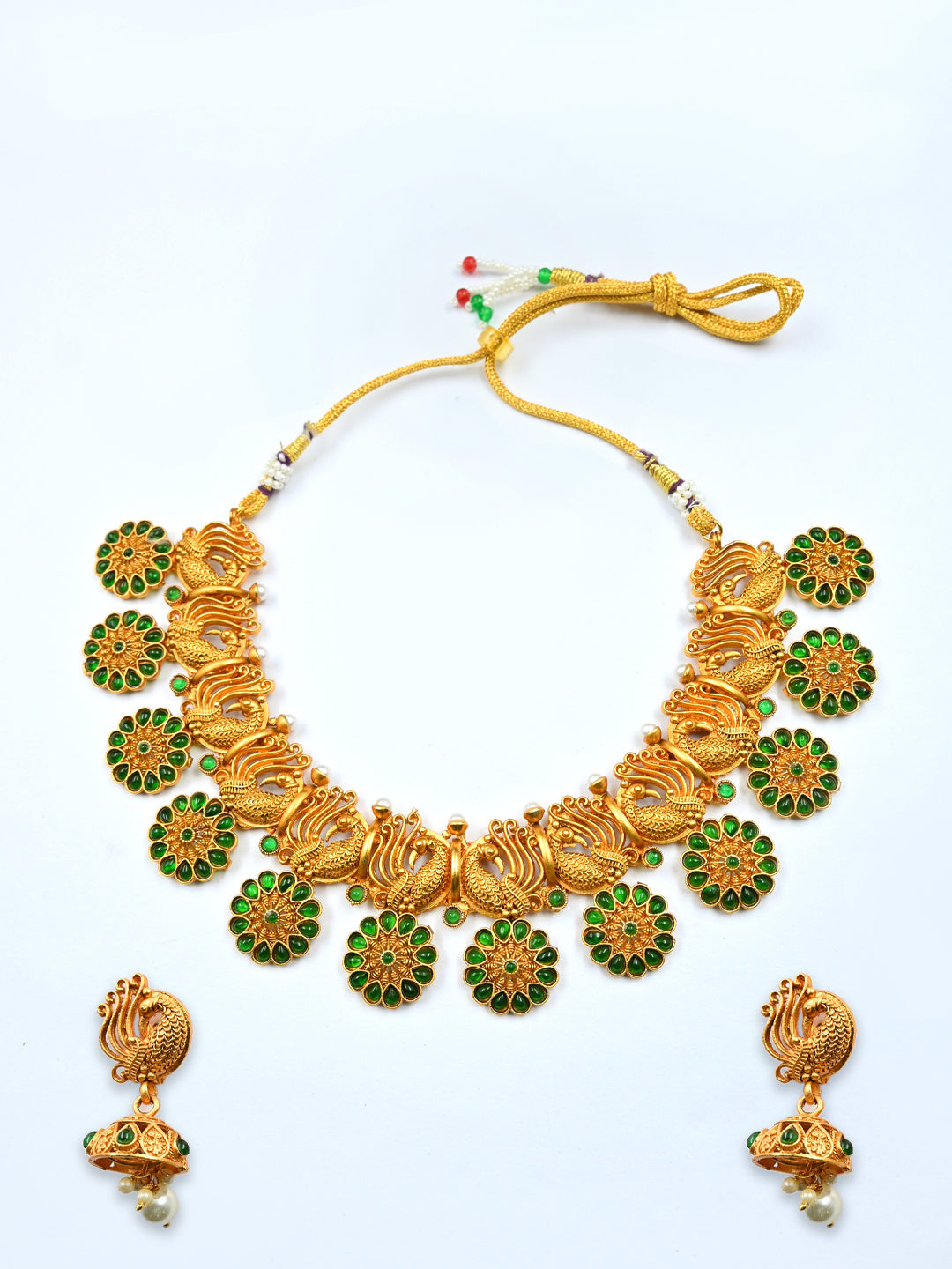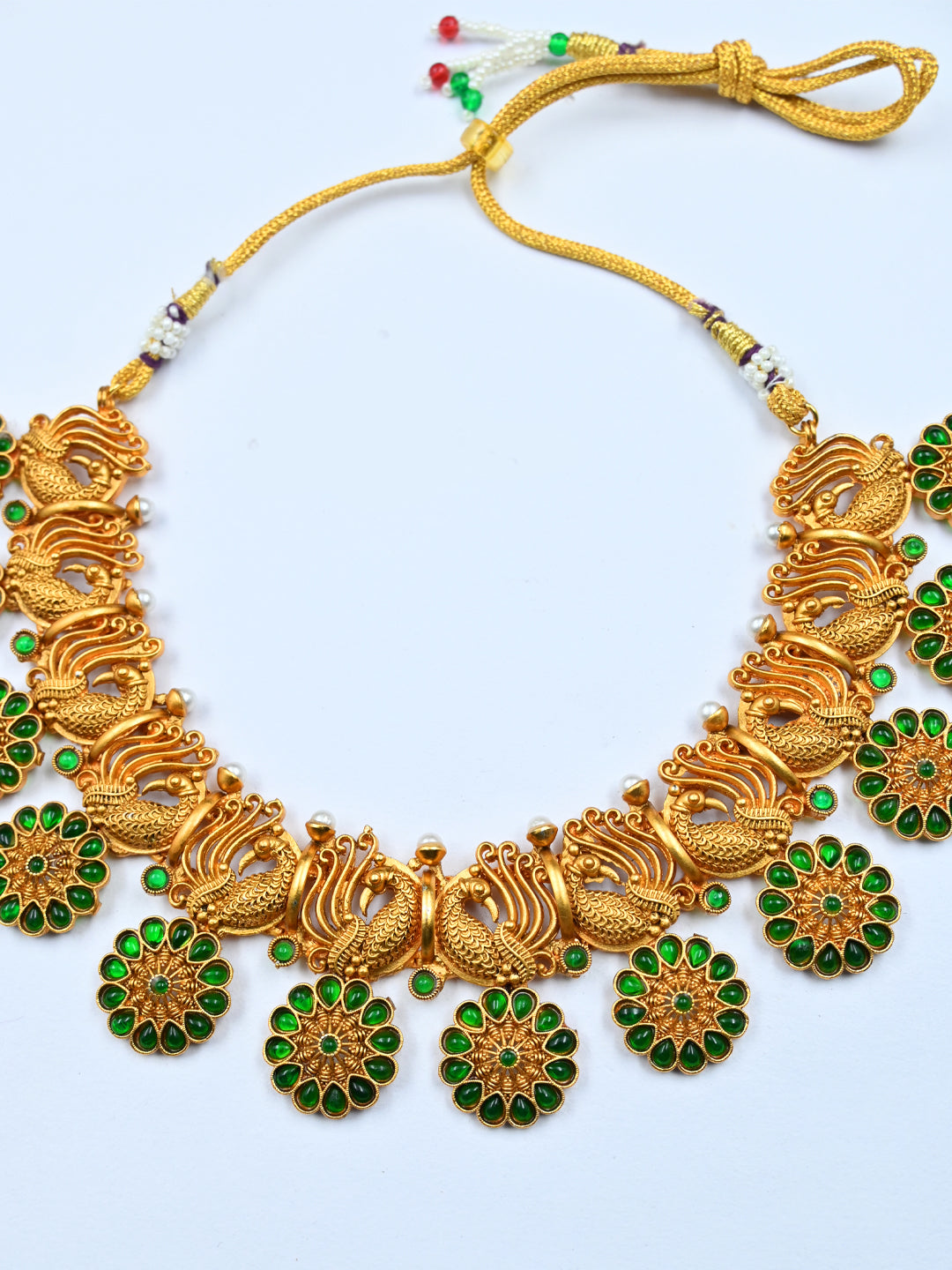 Crafted from premium copper, this traditional Kempu necklace set showcases intricate Peacock and flower motifs inspired by classical Indian jewelry design. The warm, lustrous finish of copper complements the ornamental detailing, making it an ideal choice for festive occasions and cultural celebrations. This versatile set pairs beautifully with traditional attire while maintaining timeless elegance.