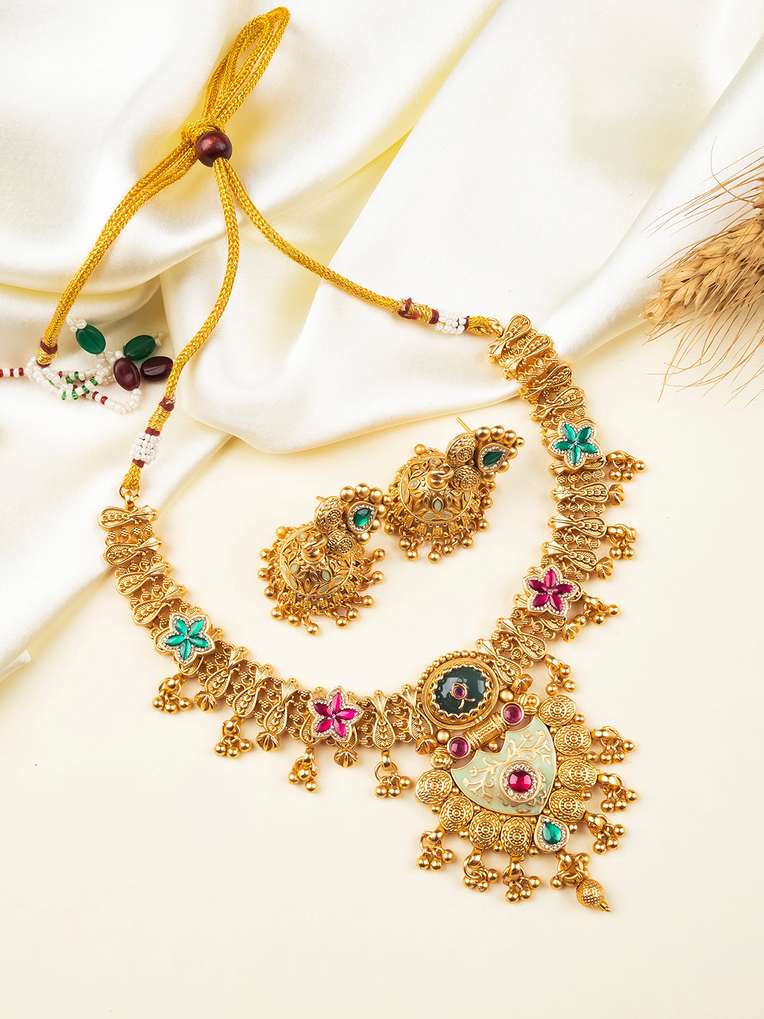 This exquisite Rajwadi plated necklace set showcases a stunning bandhai design adorned with vibrant multicolour stones, this premium set combines timeless elegance with contemporary appeal. The matching jhumkis add graceful movement and authentic charm, making it an ideal choice for weddings, festivals, and special occasions. Crafted with precision plating for lasting lustre, this versatile set seamlessly transitions from traditional wear to modern styling, ensuring you make a sophisticated statement every time.