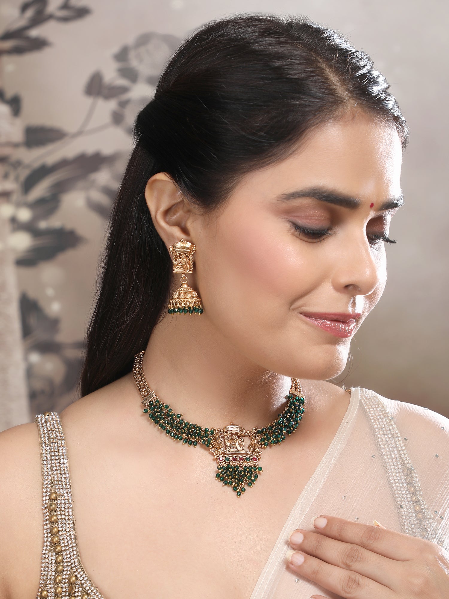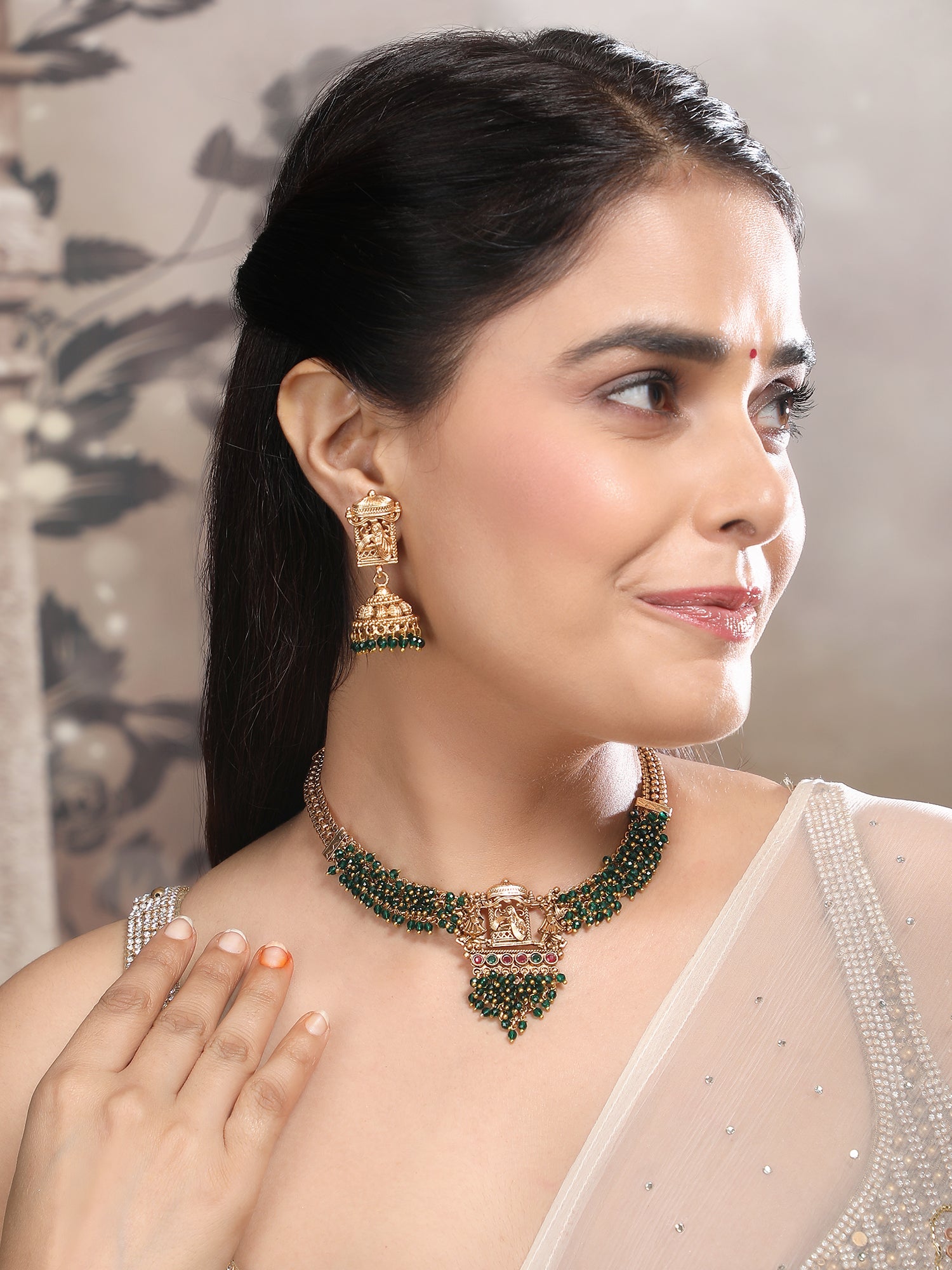 Capture timeless elegance with this Traditional Doli Style Necklace Set adorned with vibrant green hydra beads. Designed to complement ethnic attire, it adds a rich, festive touch to your look while showcasing artisanal craftsmanship. Perfect for weddings and special occasions, this set ensures you stand out with its unique blend of tradition and color.